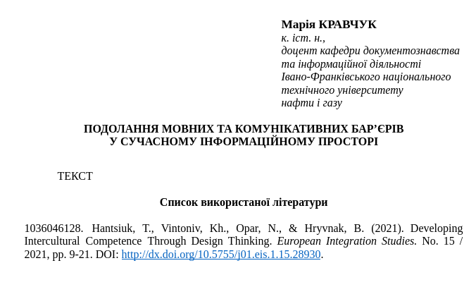 - Якщо в тексті є посилання на цитовані та використані наукові і документальні джерела, їх слід навести в кінці основного тексту в алфавітному порядку під заголовком «Список використаної літератури» з дотриманням усіх бібліографічних вимог, передбачених державними стандартами. Список літератури має містити лише джерела, на які є посилання в тексті; приклад оформлення посилань: [1, с.105]. Зверніть увагу, що список літературиоформлюється з урахуванням розробленого Національного стандарту України ДСТУ 8302:2015 «Інформація та документація. Бібліографічне посилання. Загальні положення та правила складання».